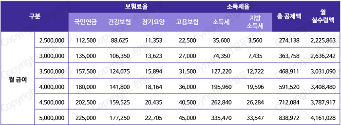 월 급여별로 실수령액을 정리한 표입니다. 월급여가 250만 원인 경우 실수령액은 2,225,863원, 300만 원인 경우 2,636,242원, 350만 원인 경우 3,031,090원 400만 원인 경우 3,408,480원, 450만 원인 경우 3,787,917원, 500만 원인 경우 4,161,028원으로 계산되었습니다.